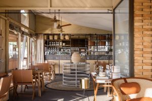 Las espaciosas tiendas de Sabora han sido diseñadas con un estilo contemporáneo y minimalista que mantiene la esencia de un safari tradicional. Cada suite ofrece terraza privada con vistas infinitas hacia la sabana, camas king-size, baños de lujo y pequeños detalles que transforman la experiencia en algo único: desde duchas al aire libre hasta rincones para relajarse contemplando manadas de cebras, ñus y jirafas que pasan frente al campamento.